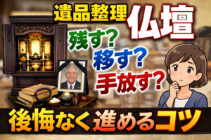 ここをスムーズにするコツは、いきなり“処分するかどうか”を決めないことです。まずは仏壇の中身や関係する品を確認し、次に「残す/移す/手放す」の選択肢を並べて、家族で判断基準を共有する。これだけで遺品整理の進み方が変わります。